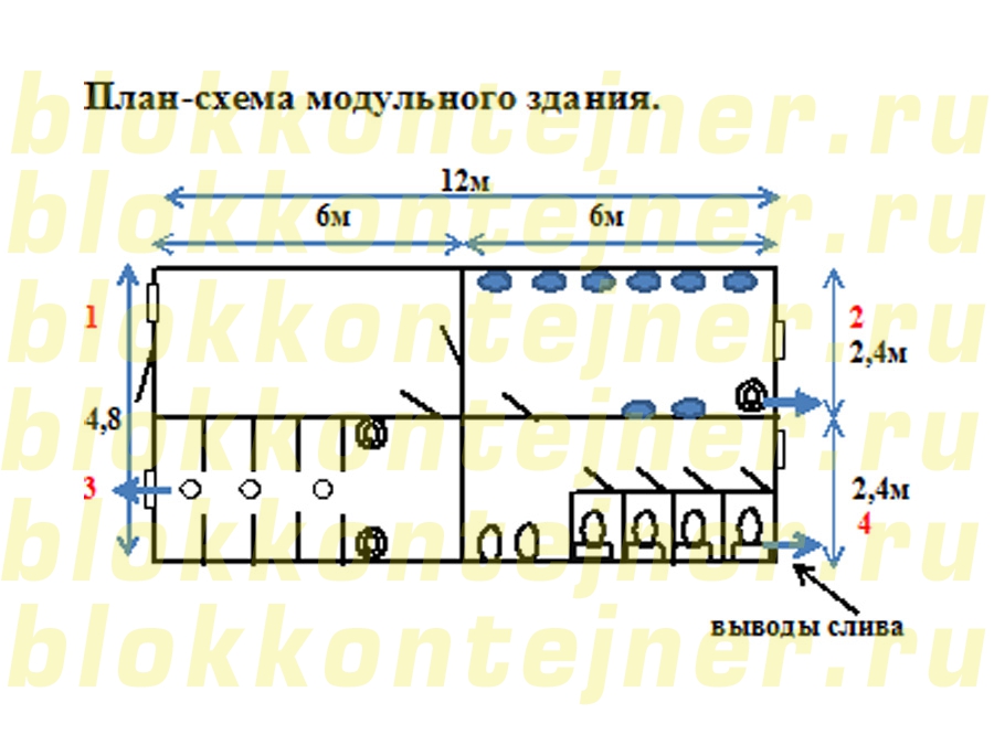 Модульное здание «Санузел» -  12,0 *4,8*2,5м  состоит из 4 шт.